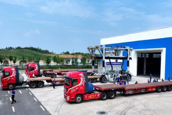 6月14日,位于湖北省宜昌市夷陵區龍泉鎮的宜昌楚能新能源創新科技有限公司集裝箱車間門口,6輛大貨車一字排開,裝載著6個楚能20尺5MWh電池集裝箱整裝待發,即將啟航新疆。