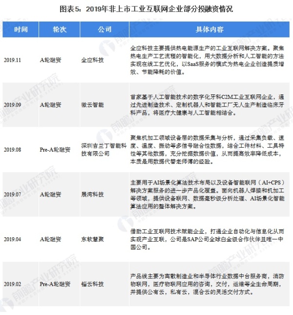 從非上市工業(yè)互聯(lián)網(wǎng)企業(yè)的具體投融資情況看,由于我國(guó)工業(yè)互聯(lián)網(wǎng)處于起步階段,除了初具規(guī)模的上市企業(yè)可通過(guò)股權(quán)、債權(quán)融資之外,對(duì)于初創(chuàng)型的非上市工業(yè)互聯(lián)網(wǎng)企業(yè)來(lái)說(shuō),資本市場(chǎng)對(duì)其同樣較為青睞。從2019年非上市工業(yè)互聯(lián)網(wǎng)企業(yè)部分投融資情況來(lái)看,投融資輪次多為A+輪及以前階段,2019年累計(jì)發(fā)生A+輪及以前階段投融資事件共456件,占比超過(guò)六成,多數(shù)企業(yè)仍處于成長(zhǎng)期。涉及的工業(yè)互聯(lián)網(wǎng)公司業(yè)務(wù)也多樣,有工業(yè)互聯(lián)網(wǎng)解決方案的全應(yīng)科技,有將醫(yī)療大健康與人工智能相結(jié)合的微云智能等。