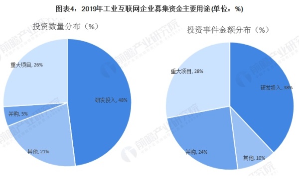 關(guān)于工業(yè)互聯(lián)網(wǎng)企業(yè)募集資金主要用途,2019年共有24家上市企業(yè)公開(kāi)資金主要用途。上市公司融資主要用途包括研發(fā)投入與重大項(xiàng)目等,占比分別達(dá)到48%和26%;結(jié)合投資事件金額分布看,并購(gòu)用途投資數(shù)量雖然僅占5%,但是其投資金額占比達(dá)到24%,表明上市企業(yè)融資除了重大項(xiàng)目與研發(fā)投入之外對(duì)于并購(gòu)的需求也較大。