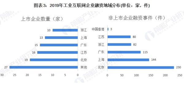 從工業(yè)互聯(lián)網(wǎng)企業(yè)融資地域分布來(lái)看,上市企業(yè)方面,在100家工業(yè)互聯(lián)網(wǎng)上市企業(yè)中,企業(yè)注冊(cè)地在浙江的有10家,上海有13家,北京有19家。其中東部地區(qū)擁有的企業(yè)超過(guò)八成。非上市企業(yè)融資事件數(shù)量方面,與上市企業(yè)分布類(lèi)似,長(zhǎng)三角地區(qū)、京津冀地區(qū)、粵港澳地區(qū)發(fā)生投融資事件較多,占全國(guó)比重超過(guò)八成,已公布投融資事件發(fā)生金額占全國(guó)95%以上。其中北京地區(qū)投融資事件數(shù)量共230件為全國(guó)最多;其次,上海和廣東地區(qū)投融資事件數(shù)量分別為144件和115件。
