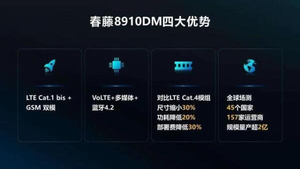 所以,在工信部明確2G/3G退網策略后,Cat.1是海量物聯網連接的最佳選擇。而要選擇Cat.1芯片,自然非紫光展銳莫屬。其在去年11月發布的全球首顆LTE Cat.1 bis芯片平臺春藤8910DM,已在多個領域實現落地應用,能夠為中下游廠商提供全場景多連接的物聯網芯片、以及相應的技術解決方案。