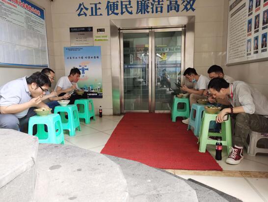 項目組在路邊吃重慶特色紅油小面(市民吃小面都是在街邊支一張小板凳配一張凳子解決)
