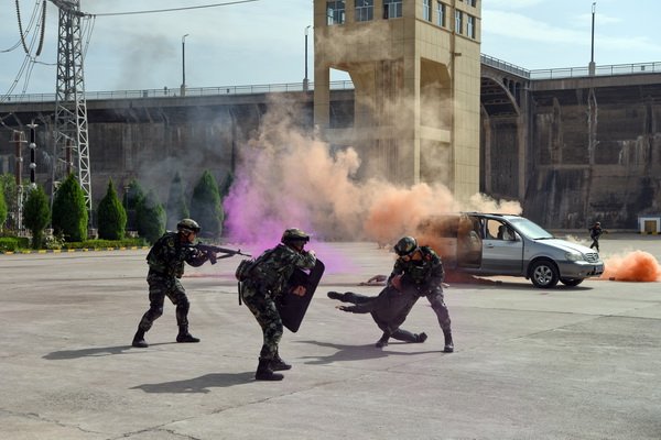 此次演練模擬恐怖分子挾持施工單位車輛,偽裝成施工人員在上班高峰期混入生產(chǎn)區(qū)域,并攜帶爆炸物意圖對大壩、330千伏開關(guān)站等重點部位實施爆炸破壞,在尋找時機實施破壞活動時被該廠測溫人員發(fā)現(xiàn),在上前詢問、檢查證件時恐怖分子身份暴露,隨后挾持測溫人員,強行進行爆炸破壞活動,最終被駐廠武警戰(zhàn)士和縣公安局防爆警察制服并成功解救被挾持人質(zhì)為場景。
