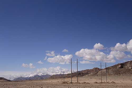 項目身處青海都蘭一望無際的戈壁灘,氣候干燥,風沙肆虐,寒風刺骨,自然條件十分惡劣,電話信號時有時無。春夏相接的五月,沙塵暴和冰雹更是常常輪番“光顧”施工現場,給施工進度和安全管理帶來不小的挑戰。對此,中國安能第二工程局青海風電項目部員工對工作沒有絲毫懈怠,大家精誠團結、眾志成城,施工生產穩步推進。此次放線工作于5月28日在5#地塊正式開始,該區段包含146基鐵塔,放線長度37900米,109.8噸重的導線翻越山巒,在平均海拔3000米的荒漠戈壁攀行30天,最終于五標段2-G67號塔位進行交匯。
