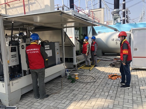 母線PT主要供輔助并網(wǎng)、繼電保護和監(jiān)測母線運行狀態(tài)使用,特高壓淮南站在初期建設(shè)時設(shè)計安裝單相PT,今年開展了1000千伏母線B、C相加裝PT工作。公司調(diào)配精干力量組成專項工作小組,提前勘察作業(yè)現(xiàn)場,工地監(jiān)督人在現(xiàn)場再三強調(diào):“作業(yè)現(xiàn)場有真空機、空氣干燥機、200噸吊車、25噸吊車和8噸吊車等多臺大型機具,相鄰間隔帶電運行,一定要提前規(guī)劃好車輛作業(yè)路線和機具、物料擺放位置。”由于工期緊張,每天現(xiàn)場作業(yè)時間長達12個小時,公司在全力做好疫情防控工作的同時,采用“工地監(jiān)督+到崗到位+全時段視頻稽查+不定期檢查”四合一的方式扎實開展現(xiàn)場安全管控工作,此次工程結(jié)束將有效降低特高壓淮南站GIS在系統(tǒng)調(diào)試和運行中空充主母線時的放電故障率。