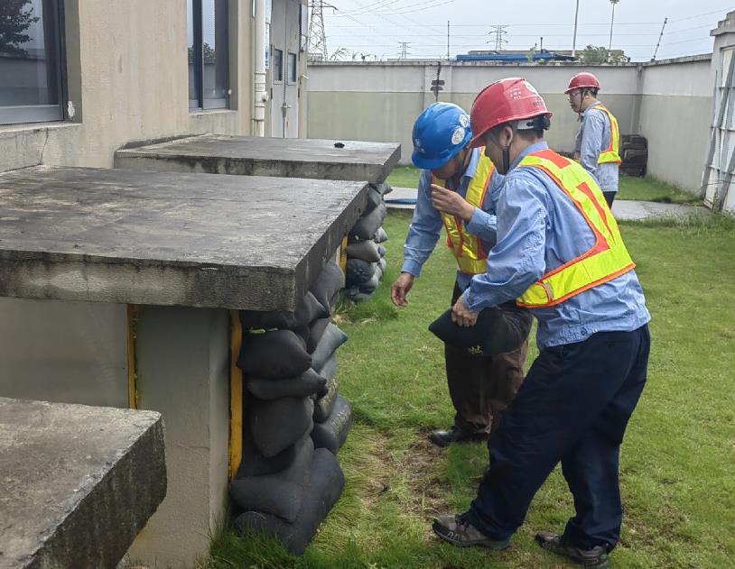 ▲上海電力長興燃機電廠一線員工在補給水泵房區域對風道口布置沙袋,確保防汛無死角。