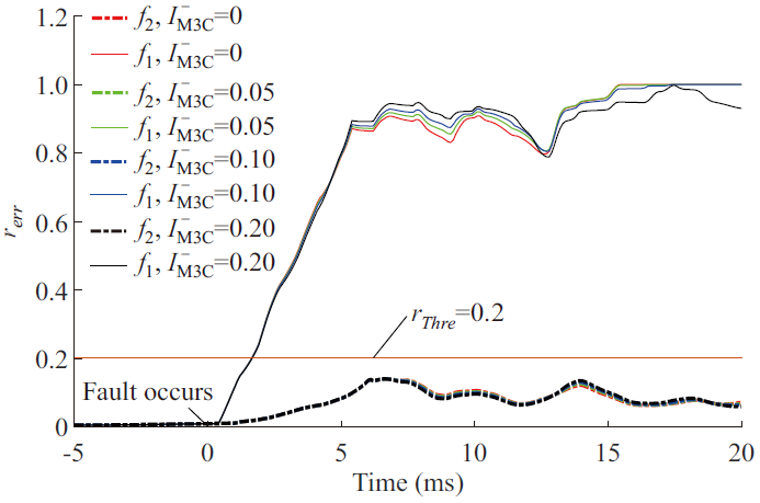 縱聯電流差動保護憑借其優異性能成為新能源送出高壓交流線路主保護。在同步機系統中,故障線路兩側電流基本同相,縱聯電流差動保護具有很高的靈敏度。新能源場站接入強電網場景下,即便新能源側與電網側故障電流相位差異較大,但因二者提供故障電流幅值的能力有顯著區別,當幅值差大于特定值時,使得任何電流相位差下縱聯電流差動保護都能正常工作。相較于前兩個場景,在低頻輸電系統中,縱聯電流差動保護的靈敏度與GSC和M3C提供的負序電流密切相關。兩者注入的負序電流越低,靈敏度越低,從而引起保護誤動作。單相接地故障及兩相相間故障下,當GSC和M3C均抑制其輸出負序電流時,故障支路電流在穩態時理論值降為0,因此僅基于電流的穩態量保護將在原理上失效。