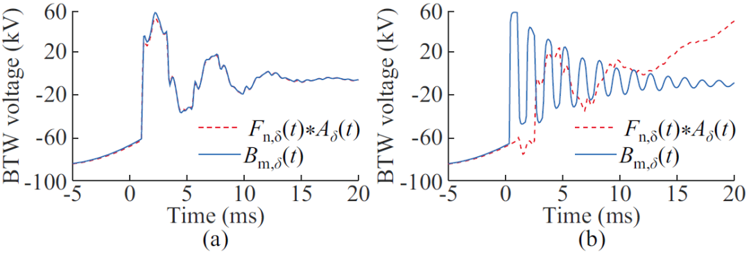 圖3 經本端與對端模量信息計算的電壓反行波對比 (a) 區外故障 (b) 區內故障