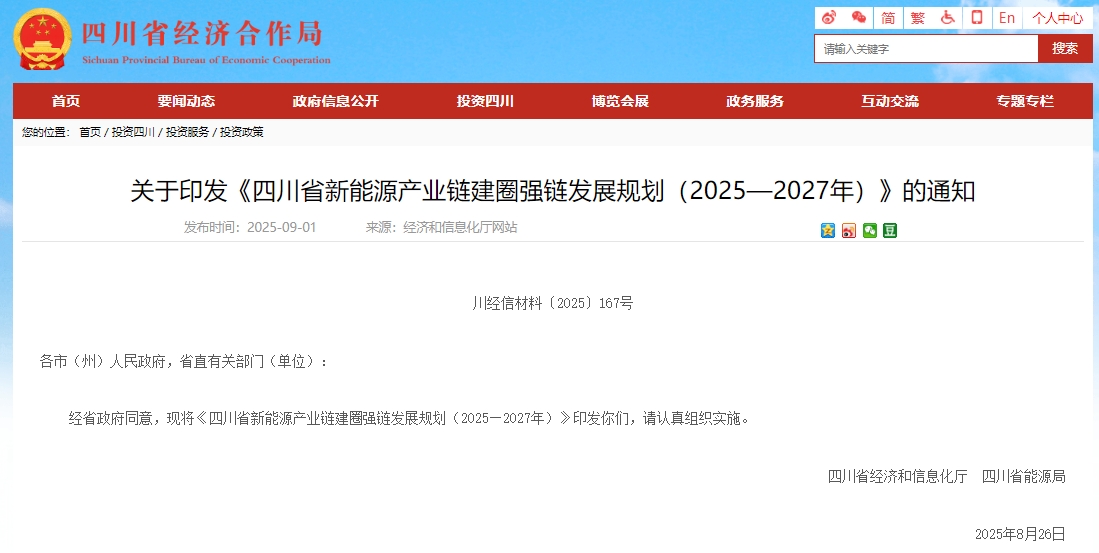 近日,四川省經濟和信息化廳聯合省能源局印發《四川省新能源產業鏈建圈強鏈發展規劃(2025—2027年)》(以下簡稱《規劃》)。《規劃》聚焦光伏、風電、氫能、新型儲能等重點領域的產業發展綜合實力提升,提出到2027年,四川省新能源產業鏈營業收入超過5000億元,力爭達到6000億元的發展目標。