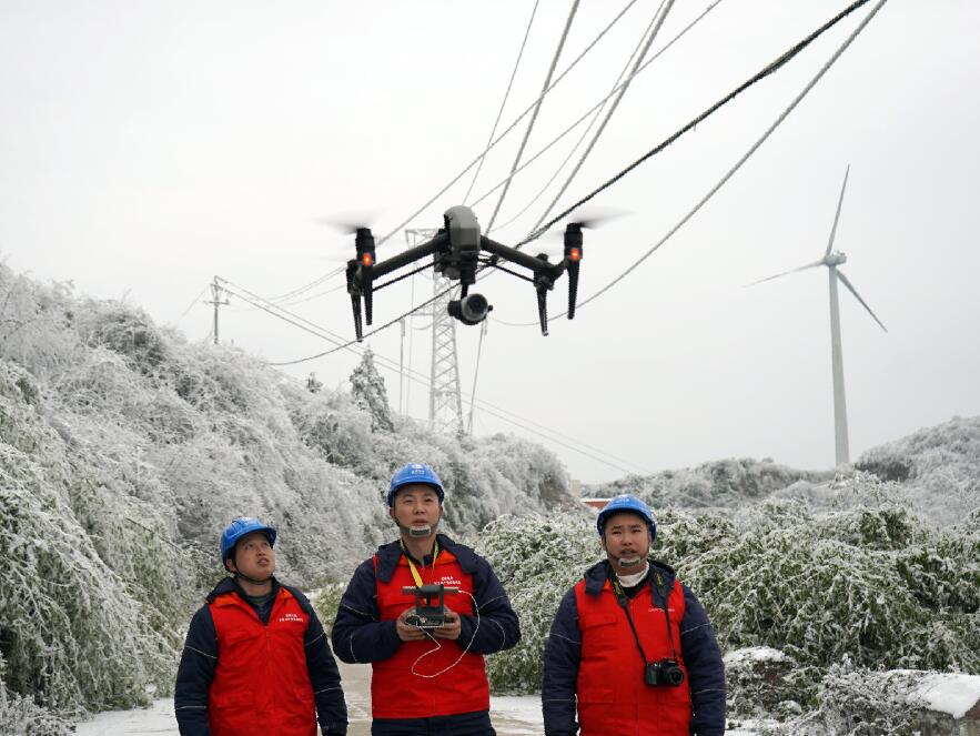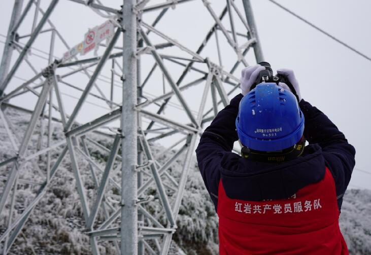 中國電力網訊 “110千伏四黎線今日最大覆冰厚度7.9毫米,目前風速3.5米每秒,溫度零下4度……”“小心一點,要走兩邊有草叢的地方,中間的道路結冰了,容易滑倒。”1月9日,國網重慶武隆供電公司輸電運維檢修班成員吳鼎、趙樓等人來到武隆區和順鎮四眼坪鄉對覆冰線路開展特殊巡視。在白雪皚皚的四眼坪,國家電網紅巖共產黨員服務隊隊服的顏色成了冰雪世界里最靚麗的一抹紅,他們手拿著無人機、砍刀、繩索、望遠鏡、風速儀等設備再一次踏入他們熟悉的“冰雪戰場”。