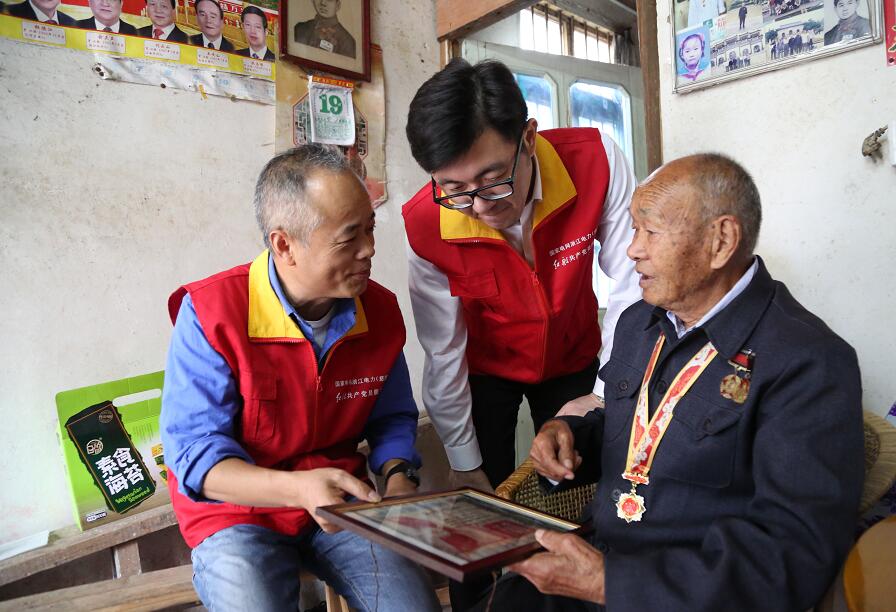 中國電力網訊 11月19日上午,浙江慈溪市供電公司紅船共產黨員服務隊王軍浩、宋鑫等黨員志愿者,帶著水果、牛奶等慰問品,懷著對退伍老兵的崇敬之情,來到坎墩街道三群村,走訪看望了九旬退伍老兵傅萬久。