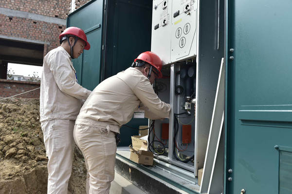 9月22日,江蘇連云港東海縣供電公司施工人員在石梁河鎮(zhèn)南辰城鄉(xiāng)融合配網(wǎng)工程安裝500千伏安箱變。