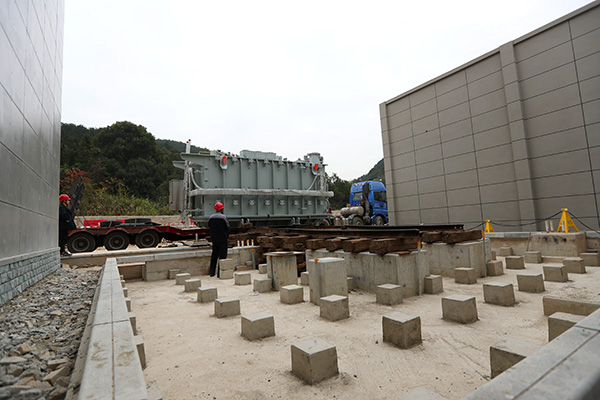 為保證變壓器順利運輸、安全就位。國網寧??h供電公司前期做了大量的準備工作,與主變廠家、運輸公司、設計、施工單位人員多次溝通協調,帶領專業技術人員多次深入現場踏勘進站便道地形、路況,組織研討運輸和安裝方案,并對主變安裝施工人員進行了全面的安全、技術交底,對施工流程、人員分工、施工關鍵點控制等進行具體安排。由于本次主變來自山東魯能泰山電力設備有限公司,距離浙江寧海長達1015公里,承載著七十二噸的龐然大物,全程運輸六十五個小時,在克服沿線空障多、橋梁多、路況復雜等困難下,終于抵達了目的地。