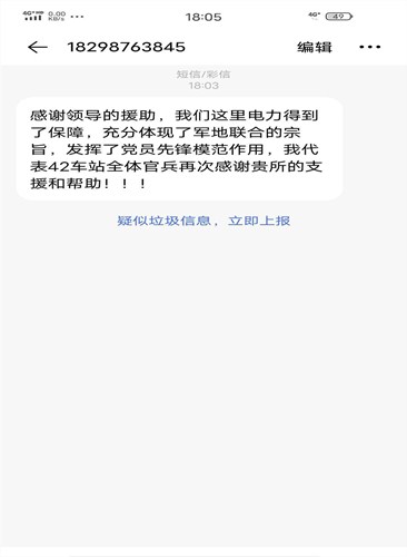 中國電力網訊 “感謝貴所的援助,我們這里電力得到了保障,充分體現了軍地聯合的宗旨,發揮了黨員先鋒模范作用,我代表42號車站全體官兵再次感謝貴所的支援和幫助!”這是一份來自國網甘肅肅南縣供電公司蓮花供電所管轄范圍內的解放軍42號車站站長發來的感謝短信,這份不尋常的感謝短信里表達著他們對該公司搶修人員快速解決部隊用電故障的感激之情。