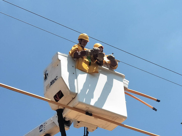 在排查好停電事故原因后,現場搶修人員開始積極的搶修線路工作,在搶修車輛到達現場,搶修人員安全措施執行到位后,搶修人員帶電作業修復導線。雖然才上午11時許,但室外的溫度就已經達到37攝氏,搶修人員登上升降車,在保證安全,規范操作的情況下,開始了導線的修復工作,搶修現場有序進行,在高溫酷暑的烈日下,經過了45分鐘的揮汗如雨緊急搶修,終于恢復了10KV市山官樁支線的正常運行。搶修人員在完成工作后,脫去了厚重的安全工作服,自己的衣服已經早已被汗水浸濕,望著他們身影,感嘆工作在一線搶修的師傅們真不容易,心中由衷的敬佩他們。(萬婉/文)(胡志強/圖)
