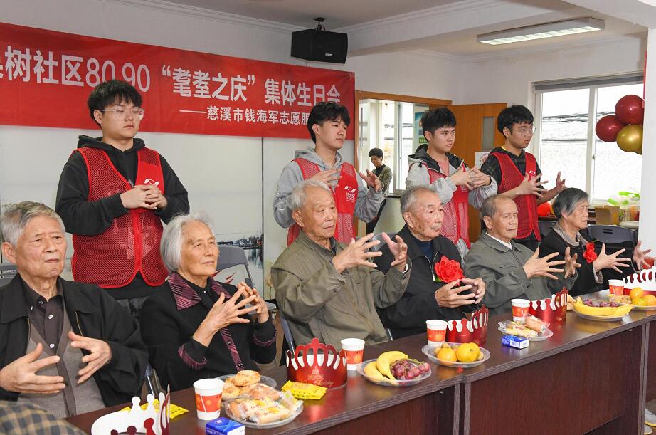 這是慈溪市白果樹(shù)社區(qū)第四屆“8090”耄耋老人集體生日會(huì)的現(xiàn)場(chǎng)。在重陽(yáng)節(jié)來(lái)臨之際,浙江慈溪市錢(qián)海軍志愿服務(wù)中心攜同白果樹(shù)社區(qū)和寧波大學(xué)科學(xué)技術(shù)學(xué)院,為社區(qū)內(nèi)30余名80歲以上老人們準(zhǔn)備了蛋糕、壽面和精彩的節(jié)目表演,提前給老人們過(guò)一個(gè)集體生日。