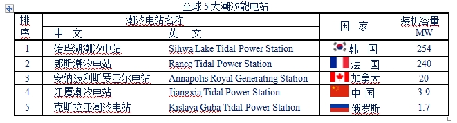 世界上最大的潮汐電站是韓國始華湖潮汐電站(Sihwa Lake Tidal Power Station),裝機容量為254MW。中國最大的潮汐電站是江廈潮汐電站(Jiangxia Tidal Power Station ),裝機容量僅為3.9MW。