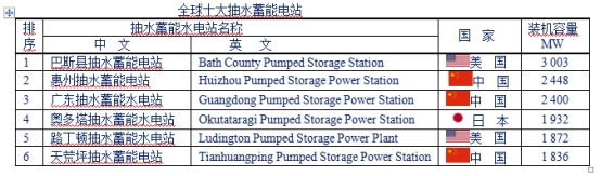 世界上第一座抽水蓄能電站是瑞士于1879年建成的勒頓抽水蓄能電站。當今世界上最大的抽水蓄能電站是美國巴斯康蒂抽水蓄能電站,裝機容量達3003MW,其次為中國惠州抽水蓄能電站,裝機容量為2448 MW,廣東抽水蓄能水電站(Guangdong Pumped Storage Power Station),裝機容量為2400MW。