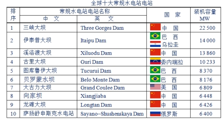 中國湖北省的三峽水電站仍然是世界上最大的水電站,總裝機容量為22.50 GW;位于巴西和巴拉圭的伊泰普水電站是世界第二大水電站,裝機容量為14.00 GW。不過,伊泰普水電站所處的巴拉那河水量豐沛且季節分布相對均衡,幾乎可以全年滿負荷發電;而三峽水電站則每年都會經歷約6個月的枯水期,從而限制了其發電量。