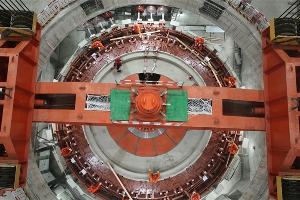 圖為雙江口水電站首臺機組轉子順利吊裝就位