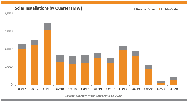 隨著疫情導致的全國范圍封鎖開始逐漸放寬,印度經濟也開始緩慢復蘇。太陽能行業也因此受到積極的影響,三季度裝機容量明顯好于上一季度。但是,該行業仍然有很長的路要走,四季度的部分項目調試日期已被批準延期至2021年上半年。