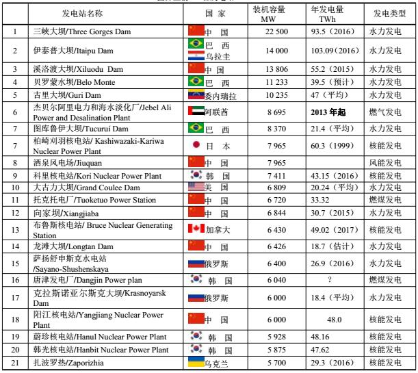 目前全球21席中,中國占有7席:水力發電占有4席:三峽大壩、溪洛渡大壩、向家壩和龍灘大壩;燃煤發電占一席:托克托電廠;核能發電占一席:陽江核電站;風電場占一席:酒泉風電場。