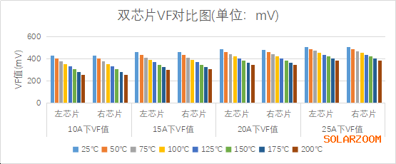 經測試發現,同一個晶圓上的2個芯片在封裝之后VF不超過3mV,這個差值在整個二極管的壓降中僅約1%,在測試誤差范圍之內,而《無法忽視的真相》一文中直接按50mV模擬分析,完全是脫離實際數據的猜想。