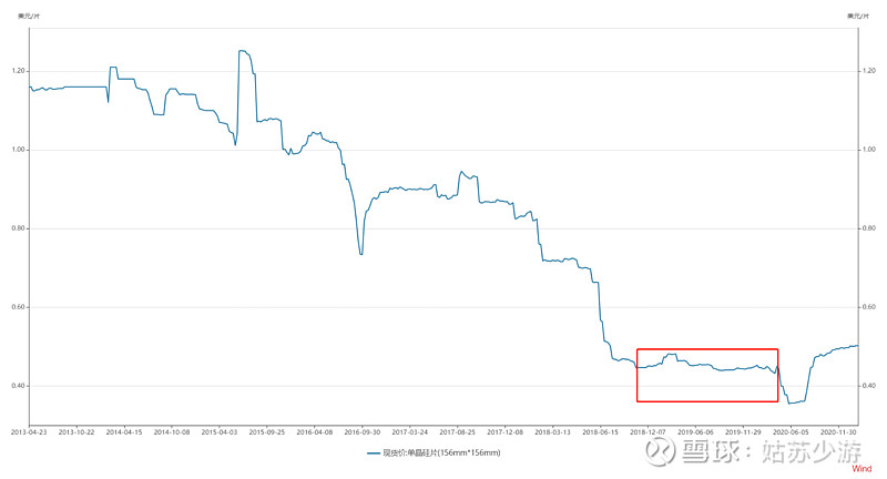 這是2011年至今的硅料價格,當年保利協鑫的產能釋放完畢,硅料價格從100美元/kg跌到20美元/kg。