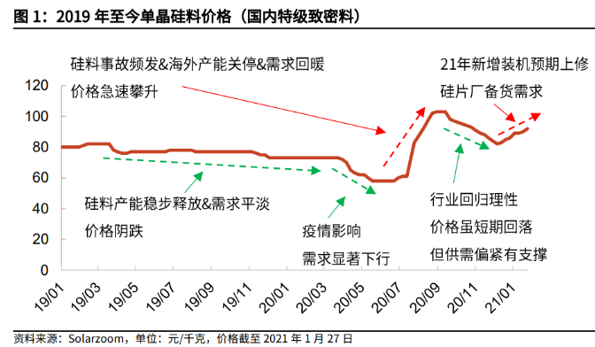 在硅料景氣度高漲的背景下,部分投資者擔(dān)心技術(shù)的更新迭代(顆粒硅技術(shù))將給硅料生產(chǎn)龍頭公司未來的發(fā)展前景帶來不確定性,但是我們認(rèn)為,當(dāng)前硅料環(huán)節(jié)的主要矛盾是2021年供需形式緊張(供不應(yīng)求)帶來的硅料供應(yīng)階段性緊缺,這也將推動硅料價格維持高位,甚至在特定時間或特殊因素催化下突破100元/千克的高位,從而保障硅料龍頭企業(yè)(通威股份、新特能源、東方希望、大全新能源等)2021年的業(yè)績增長和盈利能力維持;技術(shù)更新迭代則是當(dāng)前時點的次要矛盾,F(xiàn)BR顆粒硅技術(shù)的確有望成為下一代光伏的硅料技術(shù),但是目前顆粒硅的產(chǎn)能、下游使用占比仍相對較低,需持續(xù)關(guān)注保利協(xié)鑫2021年6月底顆粒硅產(chǎn)能擴(kuò)產(chǎn)至3萬噸后顆粒硅品質(zhì)的提升、下游硅片廠商應(yīng)用、以及成本的降低情況。(文章來源:光大證券)