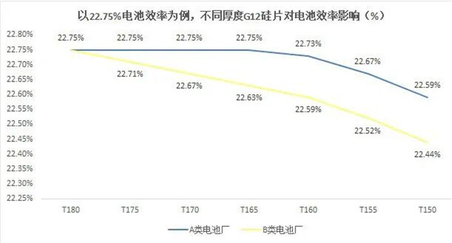 硅片減薄對效率有一定的影響,對此,中環股份提出測算。以22.75%電池效率為例,不同厚度G12硅片對電池效率影響是,A類電池廠商的生產條件下,應用160μm硅片的電池的效率,比175μm的低0.02%。