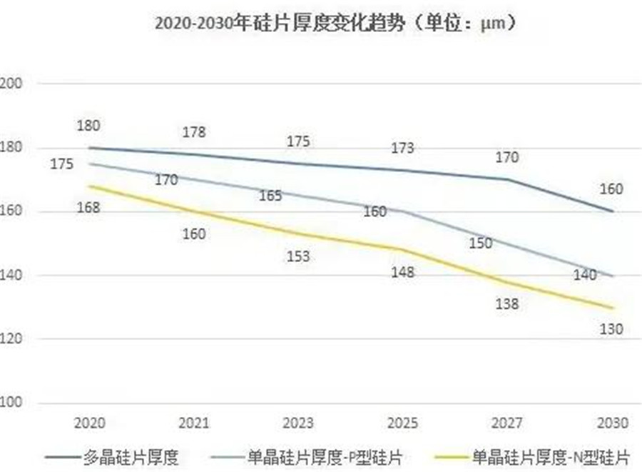 值得注意的是,N型電池對超薄硅片的適應性更高。根據《路線圖》,用于異質結的電池厚度可以降到150μm,用于MWT和IBC這兩種背接觸技術的電池可以降到130μm。