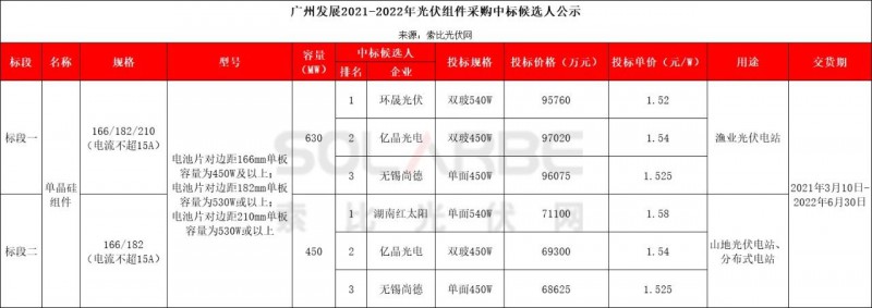 根據索比光伏網統計,廣州發展集采標段一中標候選人第一名為環晟光伏,投標單價1.52元/W,且為最低投標單價,組件投標規格為雙玻540W;標段二中標候選人第一名為湖南紅太陽,投標單價1.58元/W,組件投標規格為單面540W。詳情請見下表: