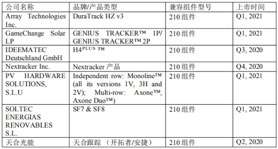 本次發布適配210組件的跟蹤支架品牌、適配產品及上市時間如下(按英文首字母排序):