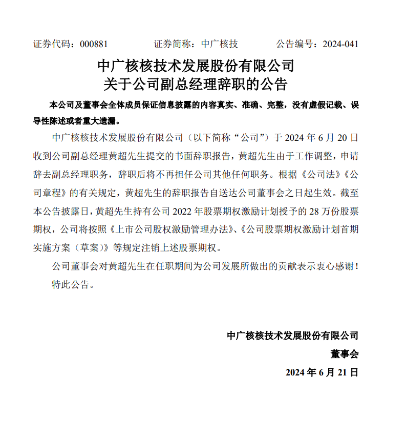 6月21日,中廣核技發布公告稱,公司于6月20日收到公司副總經理黃超先生提交的書面辭職報告,黃超先生由于工作調整,申請辭去副總經理職務,辭職后將不再擔任公司其他任何職務。