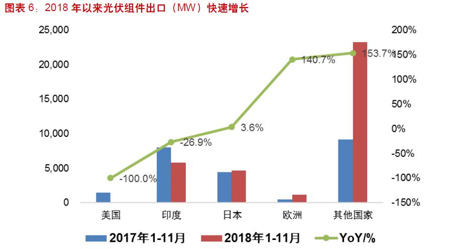中國光伏行業協會的數據顯示,2018年光伏產品(硅片、電池片、組件)出口總額達161.1億美元,創下歐美“雙反”后最高水平,同比增長10.9%。組件市場方面,光伏市場出口集中度繼續下降,形成傳統市場和新興市場(南美、中東北非)結合的多元化市場傳統市場方面,因歐盟取消了長達五年的“雙反”政策,歐洲市場復蘇,對荷蘭、德國、英國等歐洲主要國家的組件出口同比增長,對烏克蘭、西班牙的組件出口大幅增長。中國光伏行業協會預測,歐盟市場2019年增速明顯增高,可達11GW,西班牙等啟動平價上網項目,法國、荷蘭、意大利等也將有較大幅度增長。