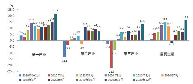 2020年,第一、二、三產業和居民生活用電量增速分別為10.7%、1.9%、1.4%、6.2%。其中,第一產業和居民生活用電量增速較上年分別上升5.0、1.5個百分點,第二、第三產業用電增速較上年分別下降0.5、7.5個百分點。第二產業用電量基本恢復常態化增長,第三產業用電量增長態勢較正常水平仍有較大差距。12月份,第一、二、三產業和居民生活用電量增速分別為21.9%、7.5%、13.6%、16.5%,第二產業用電量增速持續維持高位;第三產業用電量年內首現兩位數增長,恢復態勢強勁;居民生活用電量受低溫寒潮天氣影響,增速創年內新高。