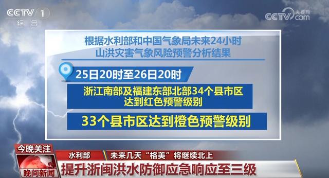 根據水利部和中國氣象局未來24小時山洪災害氣象風險預警分析結果,25日20時至26日20時,浙江南部及福建東部北部34個縣市區達到紅色預警級別、33個縣市區達到橙色預警級別。根據《水利部水旱災害防御應急響應工作規程》,水利部將針對浙江、福建兩省的洪水防御Ⅳ級應急響應提升至Ⅲ級。