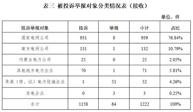 供電企業1167件、占投訴舉報總數的95.49%,其中:國家電網公司939件、占投訴舉報總數的76.84%,南方電網公司132件、占投訴舉報總數的10.79%,內蒙古電力公司25件、占投訴舉報總數的2.05%,其他地方電力企業71件、占投訴舉報總數的5.81%;發電企業3件,占投訴舉報總數的0.25%;承裝(修、試)電力設施企業52件、占投訴舉報總數的4.26%。