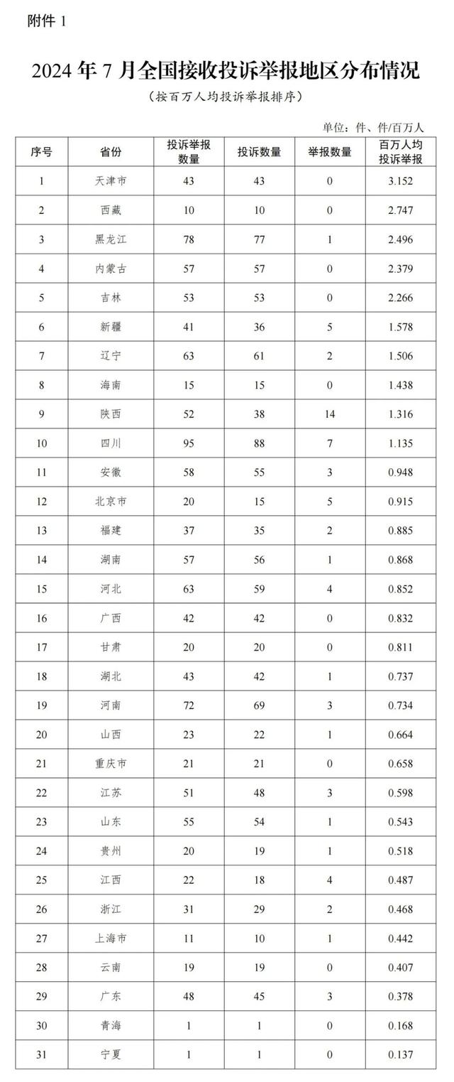 各省(自治區、直轄市)按照接收投訴舉報數量排序,四川、黑龍江、河南、遼寧、安徽排在全國前5位。按百萬人均投訴舉報數量排序,天津、西藏、黑龍江、內蒙古、吉林排在全國前5位。(2024年7月全國接收投訴舉報地區分布情況,見附件1)