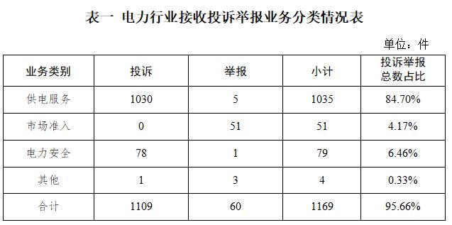 電力行業排在首位,數量為1169件、占投訴舉報總數的95.66%,主要集中在供電服務、電力安全、市場準入等方面。