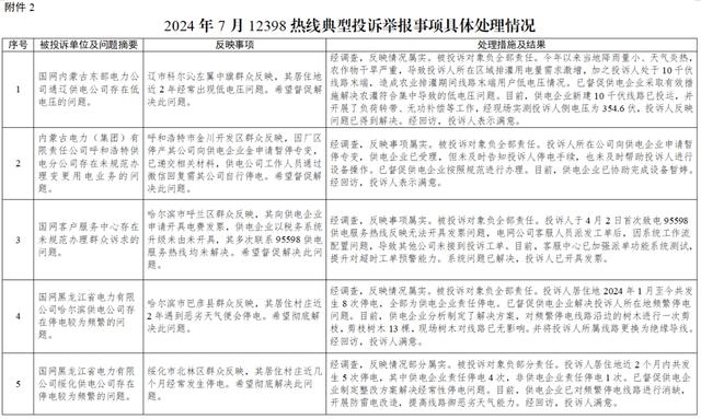 針對群眾反映的投訴舉報,國家能源局派出機構嚴格根據國家有關法規政策規定進行處理。一是督促供電企業加強臺區等設備改造力度,縮短供電半徑,提高電網轉供、互供能力,解決故障停電、低電壓等電能質量問題;二是要求供電企業加強設備隱患排查整治、停電搶修管理,加大線路巡視頻次,及時消除隱患缺陷,增加搶修資源投入,提升設備管控和停電搶修能力,切實提高供電質量;三是通過行政處罰、監管約談、責令整改等方式,糾正有關企業違法違規行為,維護公平公正的市場秩序和群眾合法權益;四是通過解釋說明、澄清事實,消除群眾誤解。(2024年7月12398熱線典型投訴舉報事項具體處理情況,見附件2)