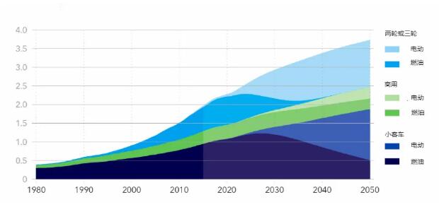 圖:全球不同類型和動力系統(tǒng)的路面交通工具數量統(tǒng)計(單位:百萬輛)
