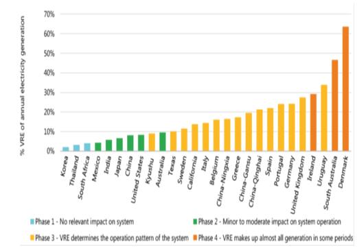 圖1 不同國家/地區波動性可再生能源發電占比及相應的系統集成階段(2018年)