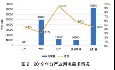 分產業來看,第三產業和城鄉居民用電成為拉動用電需求的主力軍(見圖2)。2019年第一產業用電量為780億千瓦時,同比增長4.5%,保持平穩增長;2019年第二產業用電量4.94萬億千瓦時,同比增長3.1%,占全社會用電量的比重同比降低0.9個百分點;2019年第三產業用電量1.19萬億千瓦時,同比增長9.5%,2019年城鄉居民生活用電量1.02萬億千瓦時,同比增長5.7%,第三產業和城鄉居民生活用電分別拉動全社會用電量增長1.5和0.8個百分點,合計拉動2.3個百分點,高于第二產業拉動的2.1個百分點。第三產業和城鄉居民生活用電量對全社會用電量增長的貢獻率合計達到51.0%,比第二產業對全社會用電量增長的貢獻率高3.8個百分點,其中第三產業貢獻率提高尤為明顯,為10.1個百分點。