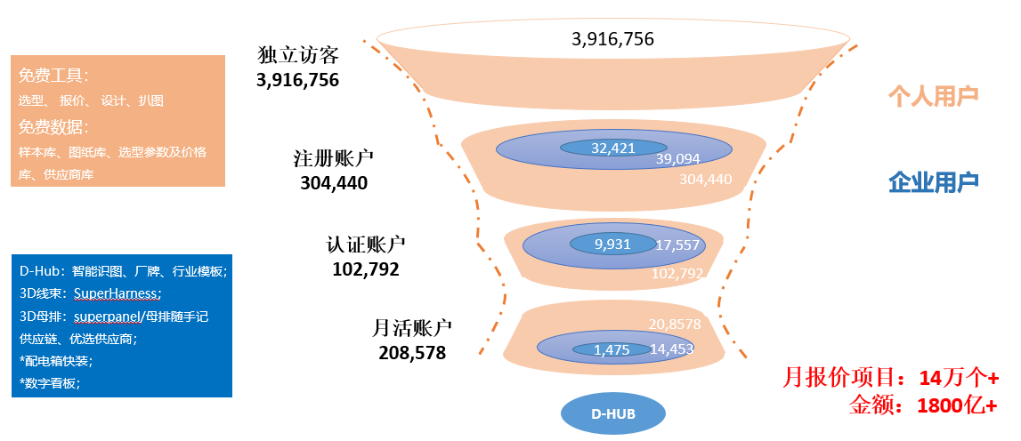 我們既然定下這個(gè)目標(biāo),就要一步一步來實(shí)施,做云端SaaS服務(wù),把原來的賣軟件的業(yè)務(wù)變成云服務(wù)。把我們?cè)瓉淼膱?bào)價(jià)軟件、設(shè)計(jì)軟件全部云端化并且共享一個(gè)數(shù)據(jù)庫。我們又做了選型軟件、生產(chǎn)安裝的軟件,目前正在開發(fā)數(shù)字看板和數(shù)字工廠,所有的這些產(chǎn)品通過D-Hub是共享同一套數(shù)據(jù)庫。我們把原來離線的產(chǎn)品都變成在線,其中一部分軟件和數(shù)據(jù)免費(fèi)為用戶服務(wù),這些免費(fèi)的軟件和內(nèi)容吸引了大量的用戶,現(xiàn)在我們的獨(dú)立訪客有390萬。當(dāng)然我們也有收費(fèi)的產(chǎn)品D-Hub。利馳已經(jīng)從一家CAD軟件公司轉(zhuǎn)變?yōu)樵诰€服務(wù)公司,我們其中的一個(gè)在線服務(wù)——電氣工程項(xiàng)目報(bào)價(jià)——最新的數(shù)據(jù)顯示一個(gè)月可以報(bào)14萬個(gè)項(xiàng)目,總價(jià)值約1800億。