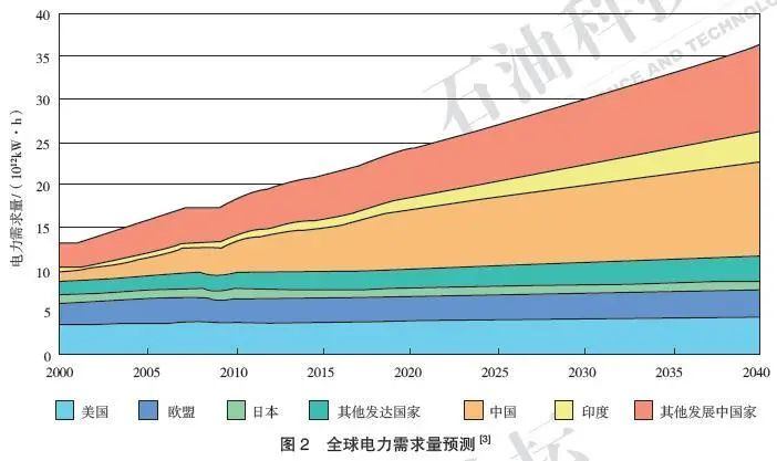 第二,現(xiàn)有能源利用系統(tǒng)變革,電力、氫能等二次能源消費(fèi)規(guī)模不斷擴(kuò)大。電力在終端能源消耗中所占的比例已從2000年的16%,增長(zhǎng)到2018年的20%。國(guó)際可再生能源署(IRENA)認(rèn)為,全球電力需求量將持續(xù)高速增長(zhǎng),2050年,電力在終端能源消費(fèi)中所占比例將提高到49%左右。國(guó)際能源署認(rèn)為,全球電力需求的增長(zhǎng)在發(fā)達(dá)國(guó)家和發(fā)展中國(guó)家將表現(xiàn)出兩條截然不同的路徑:在發(fā)達(dá)國(guó)家,電力需求增長(zhǎng)將被數(shù)字化和電氣化技術(shù)進(jìn)步帶來(lái)的能效全面提升所抵消;在發(fā)展中國(guó)家,家庭收入的增長(zhǎng)、工業(yè)規(guī)模的擴(kuò)大和服務(wù)業(yè)的發(fā)展正在有力地推動(dòng)電力需求增長(zhǎng),按照既定政策,預(yù)計(jì)2019—2040年,發(fā)展中國(guó)家對(duì)全球電力需求增長(zhǎng)的貢獻(xiàn)接近90%(圖2)。